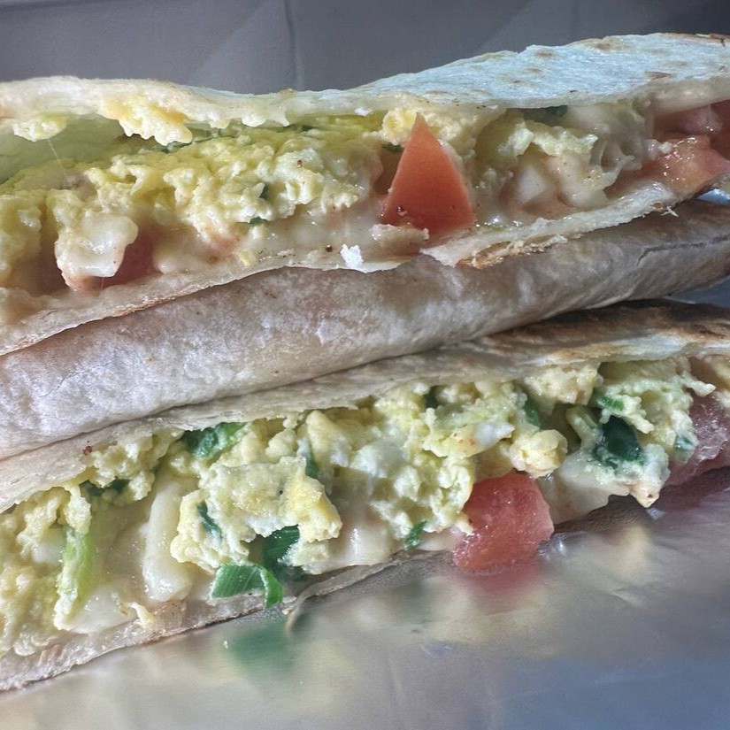 Ovos mexidos cremosos com alho-poró, mussarela suave, tomates frescos e um toque defumado de chipotle, na tortilla levemente crocante.