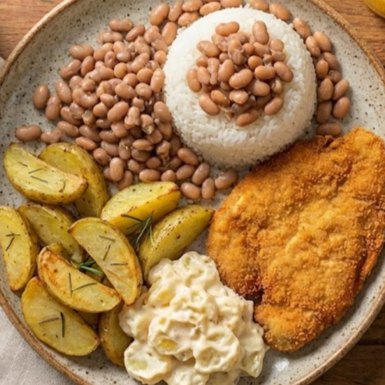 Filé de Frango à Milanesa, Batata Rústica, Maionese, Arroz e Feijão