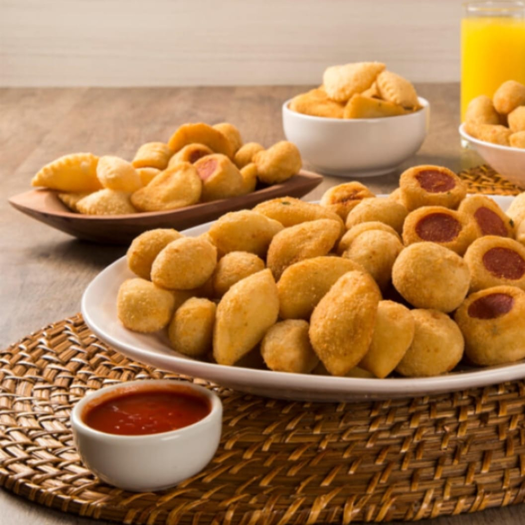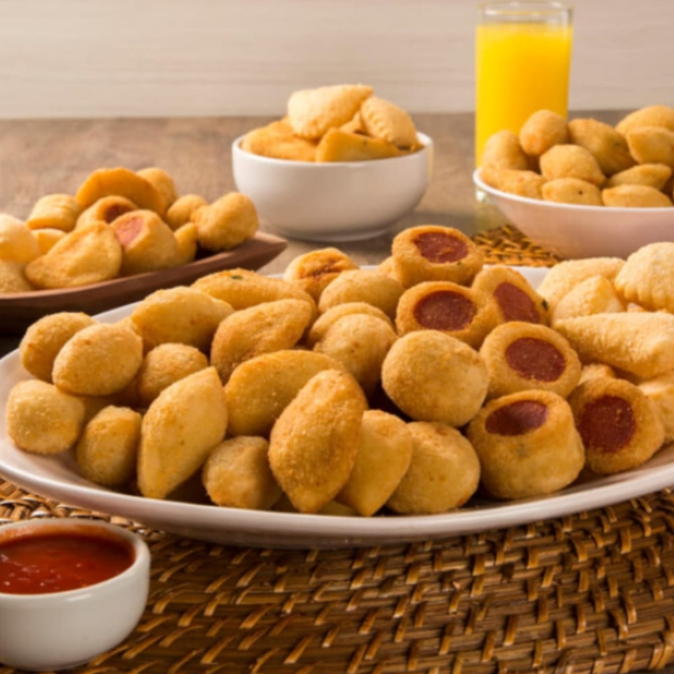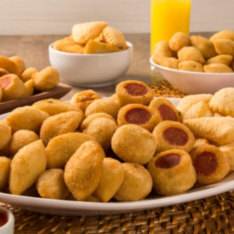 50 und de mini-salgados misto com Aprox 18 gramas cada, coxinha cremosa, risole de carne, presunto e queijo, bolinha de queijo e salsicha empanada, obs salsicha empanada solicitar por mensagem
