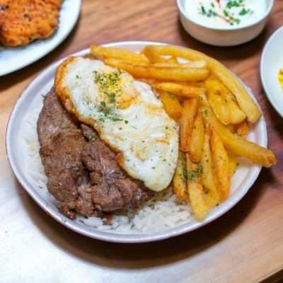 Bife acebolado saboroso servido com arroz, Feijão, batata frita e farofa