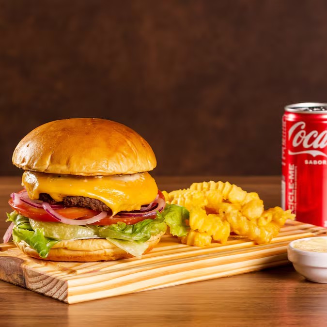 Burger no pão brioche fofinho, maionese clássica, suculento blend artesanal de 200g e duas fatias de queijo cheddar derretido. Acompanha porção de fritas crocantes e uma Coca-Cola gelada de 350ml.