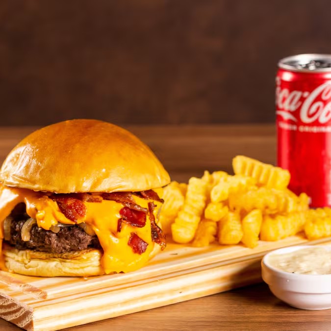 Burger no pão brioche macio, maionese da casa, suculento blend artesanal de 200g, bacon picado, cebola caramelizada no ponto certo e nosso creme de cheddar preparado na casa. Acompanha porção de fritas crocantes e uma Coca-Cola gelada de 350ml.