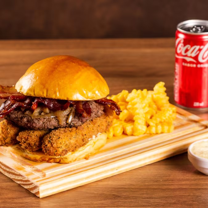 Burger no pão de brioche, maionese artesanal da casa, blend da casa de 200 gramas, queijo mussarela empanado frito , cebola caramelizada e fatias de bacon crocante. Acompanha porção de fritas crocantes e uma Coca-Cola gelada de 350ml.