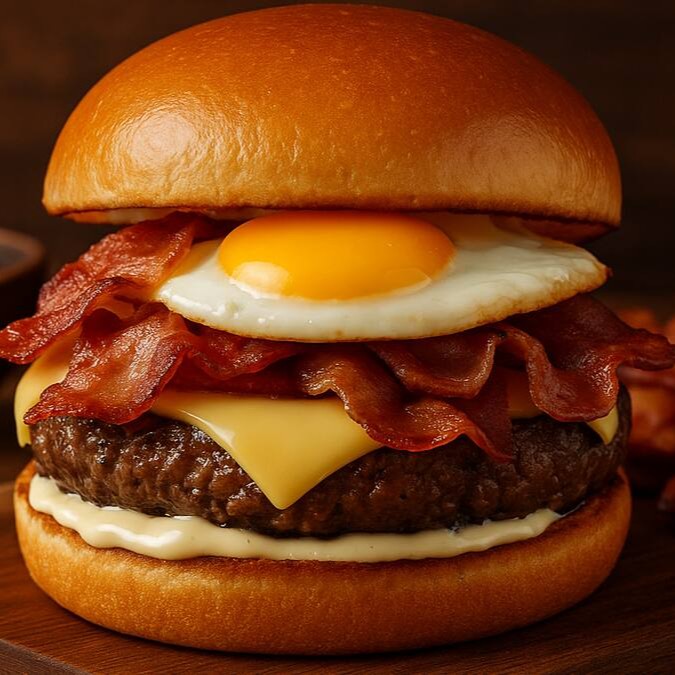Pão brioche macio, maionese artesanal da casa, suculento blend de 200g, duas fatias de queijo mussarela derretido, bacon crocante e delicioso ovo frito .
