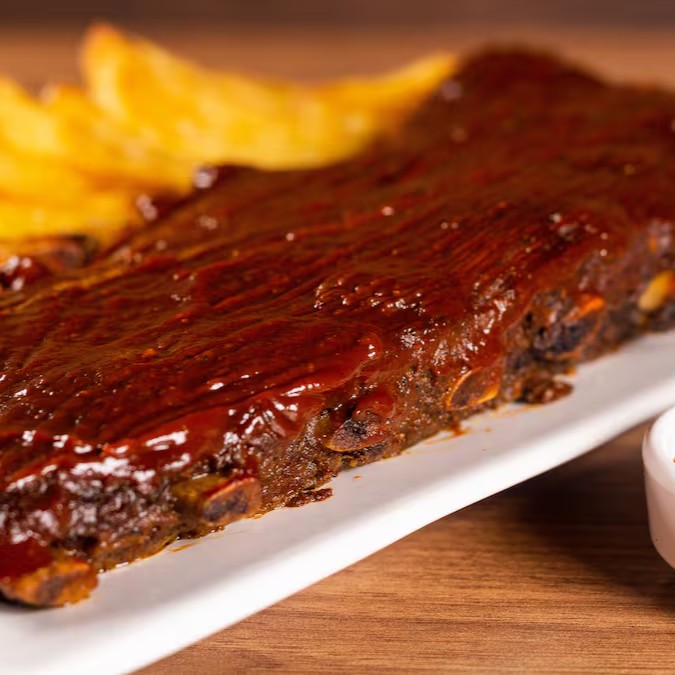 Costelinha suína defumada em lenha de macieira, coberta com molho barbecue artesanal e acompanhada de batata frita crocante — uma explosão de sabor e aroma irresistível em cada mordida!