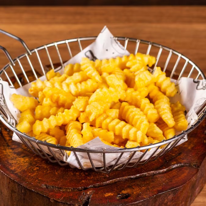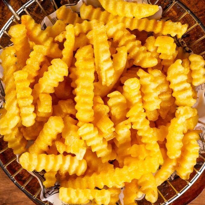 Porção grande de 400g de fritas crinkle crocantes, acompanhadas da nossa maionese da casa, perfeitas para saborear sozinhas ou compartilhar com quem você gosta!