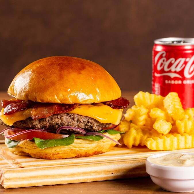 Burger no pão brioche macio, maionese da casa, suculento blend artesanal de 200g, duas fatias de queijo prato, cebola roxa fresca, rúcula, tomate e bacon crocante. Acompanha porção de fritas douradas e uma Coca-Cola gelada de 350ml.