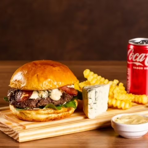 Burger no pão brioche macio, maionese artesanal da casa, hambúrguer suculento, 50g de queijo gorgonzola não aquecido na salamandra, rúcula fresca, bacon crocante e cebola roxa. Acompanha porção de fritas douradas e uma Coca-Cola gelada de 350ml.
