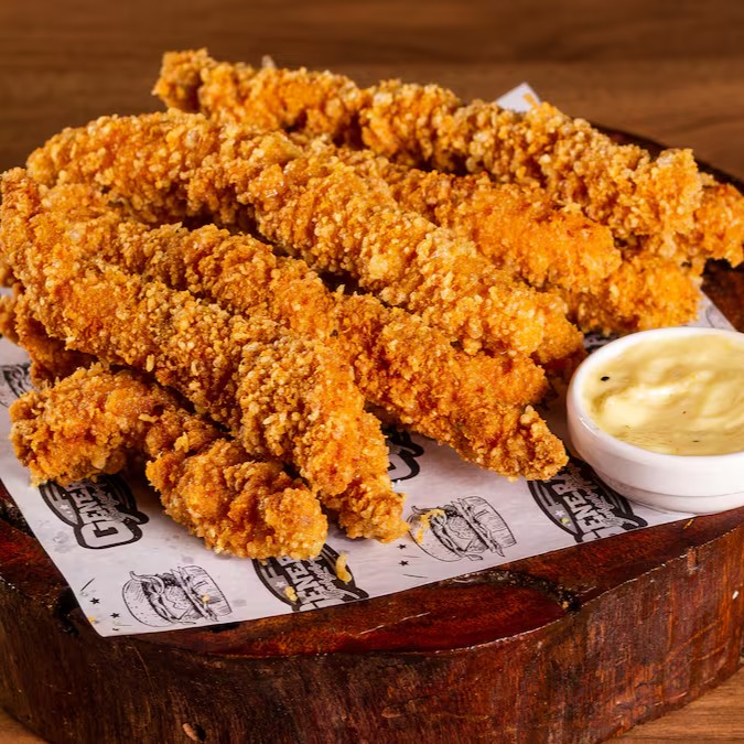 Deliciosas tirinhas de frango empanadas, acompanhadas do nosso molho especial da casa!
