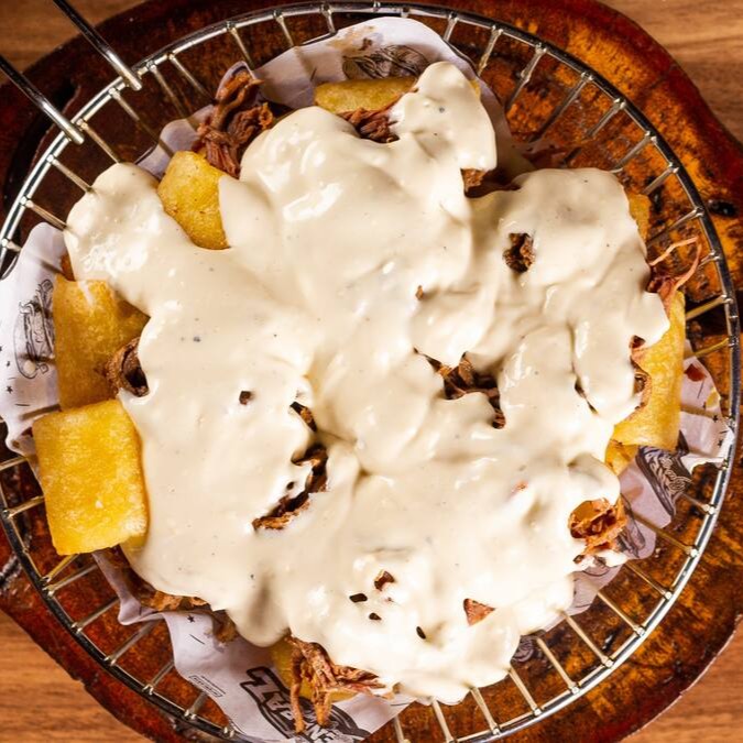 Porção de 400g de mandioca crocante, coberta com delicioso creme de queijos e costela desfiada suculenta, acompanhada da nossa maionese artesanal da casa — uma explosão de sabor em cada mordida!