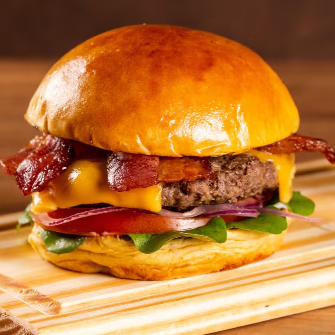 Pão de brioche macio, maionese da casa, hambúrguer suculento de 200g, 2 fatias de queijo prato derretidinho, cebola roxa fresca, rúcula crocante, tomate suculento e bacon crocante — o favorito dos nossos clientes!