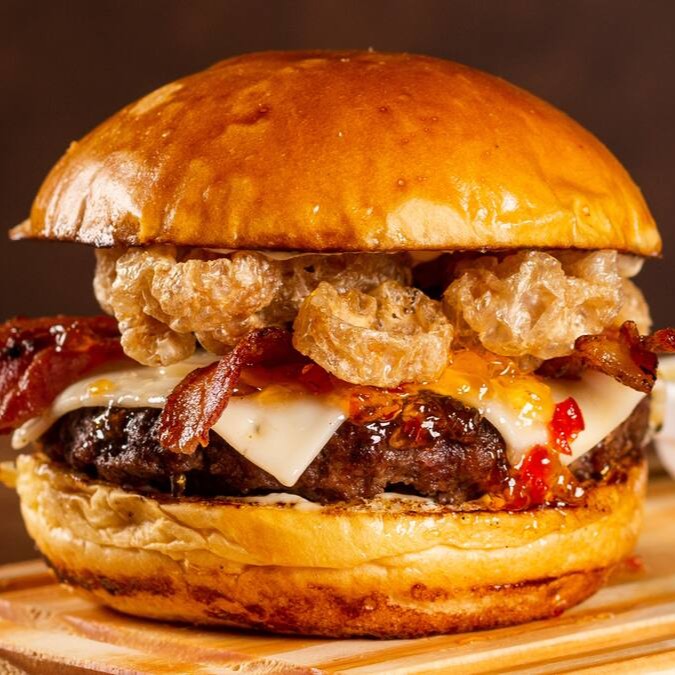 Pão brioche macio, maionese da casa, hambúrguer suculento de 200g, mussarela derretidinha, geleia artesanal de abacaxi com pimenta feita na casa, bacon crocante e torresmo crocante que dá o toque final perfeito!
