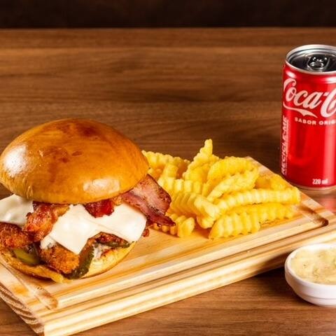 Burger no pão brioche macio, maionese artesanal da casa, incrível filé de frango empanado, duas fatias de queijo prato, picles fatiado e bacon crocante. Acompanha porção de fritas douradas e uma Coca-Cola gelada de 350ml.