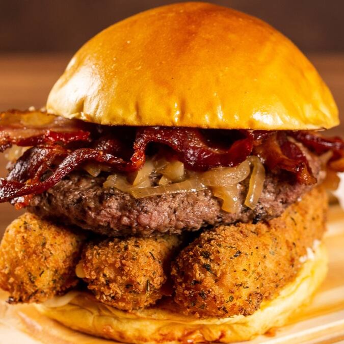 Pão de brioche macio, maionese da casa, hambúrguer suculento de 200g, queijo mussarela empanado na farinha panko, cebola caramelizada docinha e fatias de bacon crocante que dão o toque final perfeito!