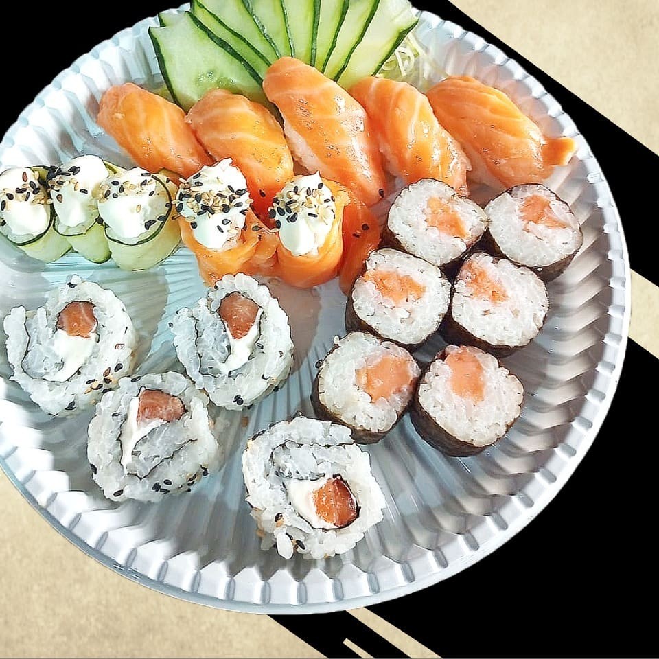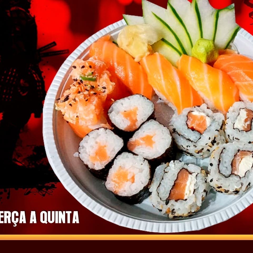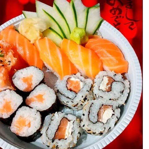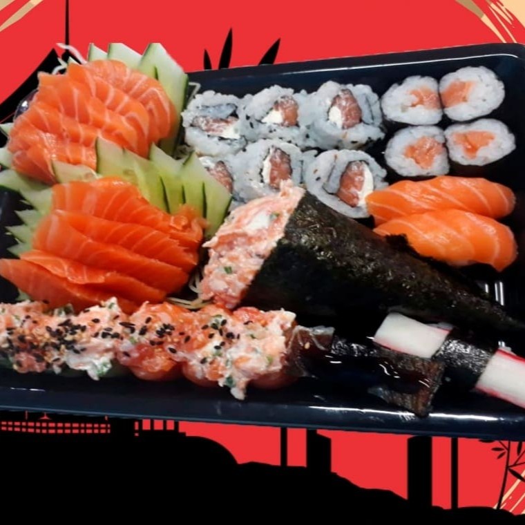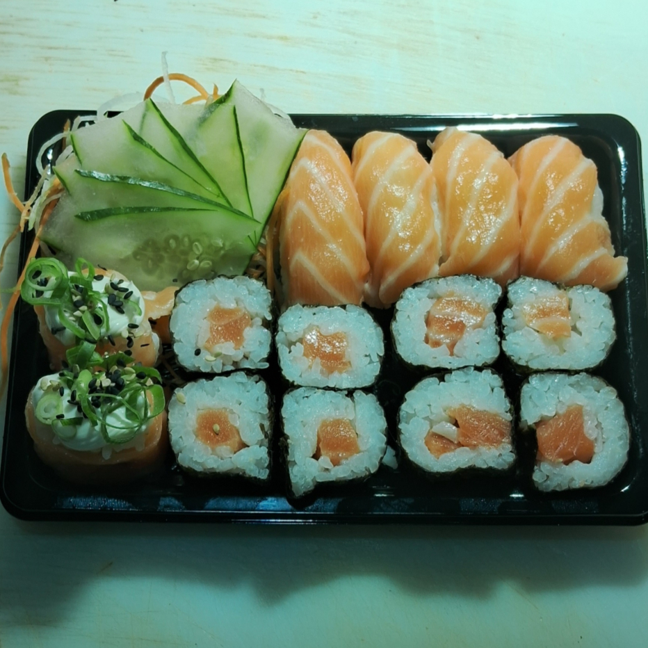 12 sashimi salmão 6 uramaki salmão 4 hossomaki salmão 3 jow pepino 3 jow salmão 2 niguiri salmão 1 niguiri iskin 1 niguiri kani 1 Temaki Filadélfia