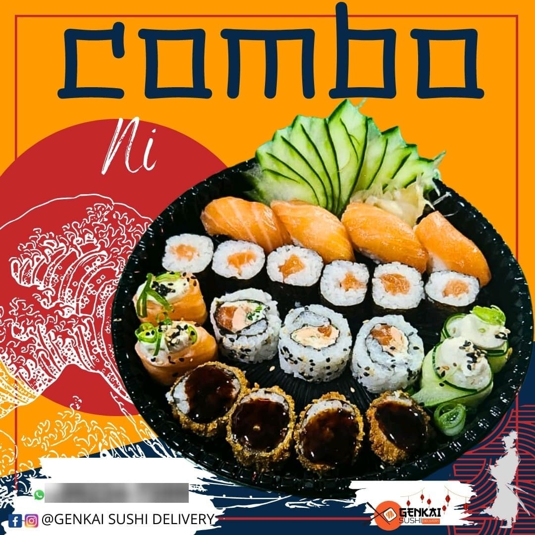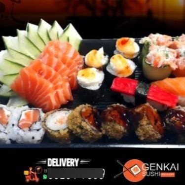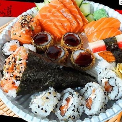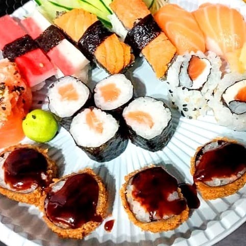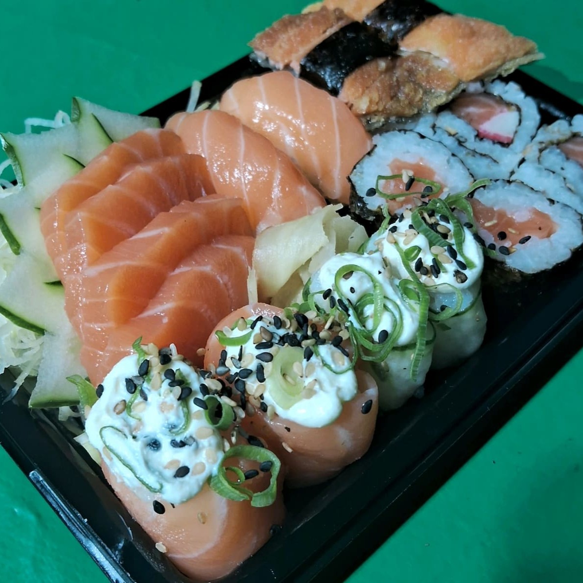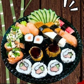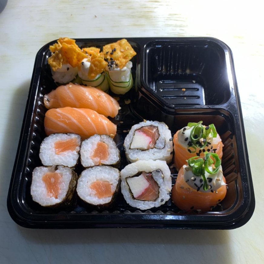 12 sashimi salmão 6 uramaki salmão 4 hossomaki salmão 3 jow pepino 3 jow salmão 2 niguiri salmão 1 niguiri iskin 1 niguiri kani 1 Temaki Filadélfia