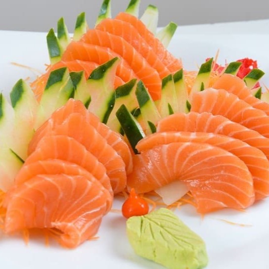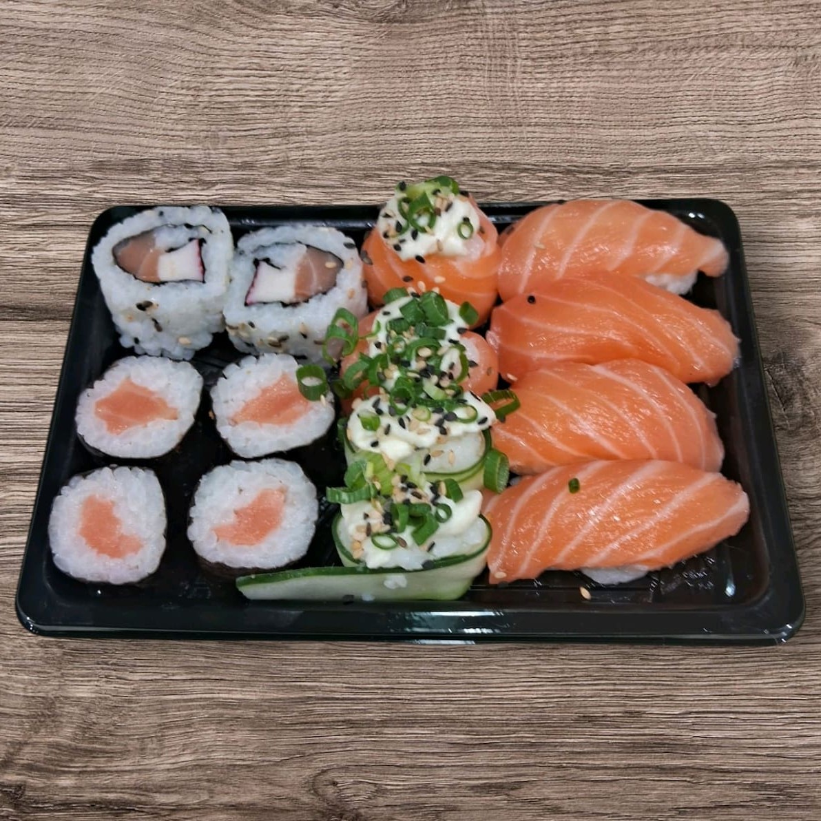 6 sashimi salmão 1 niguiri salmão 1niguiri kani 4 hossomaki salmão 2 uramaki salmão 2 jow pepino 2 jow salmão 6 hot roll