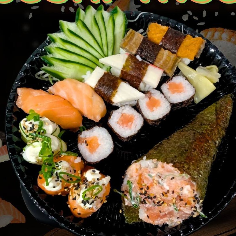 6 sashimi salmão 2 niguiri salmão 1 niguiri kani 1niguiri iskin 1 jow salmão 1 jow pepino 2 hossomaki salmão 4 uramaki 1 Temaki Filadélfia