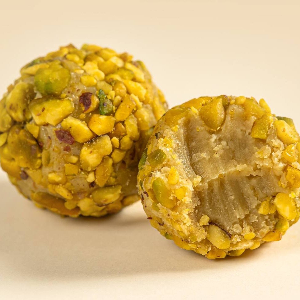 Brigadeiro de pistache coberto com pistache.