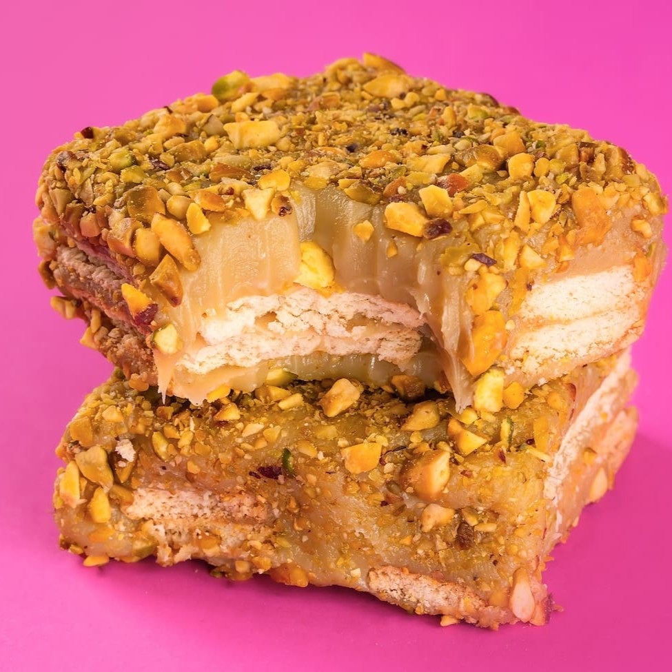 Brigadeiro cremoso de pistache, geleia artesanal de morango, pão de ló branco banhado com calda de limão e Nutella de pistache.