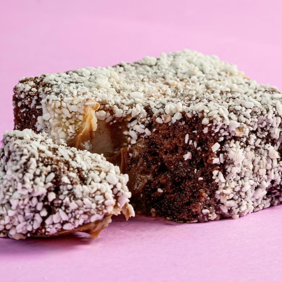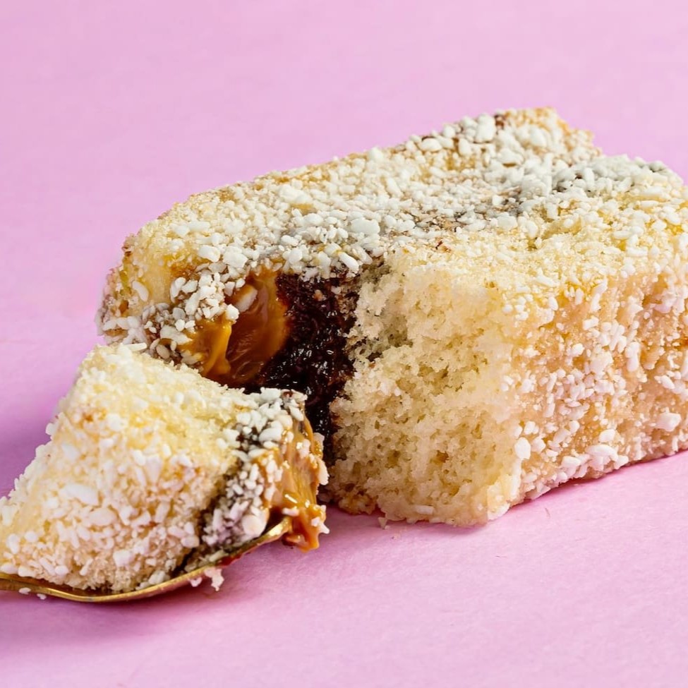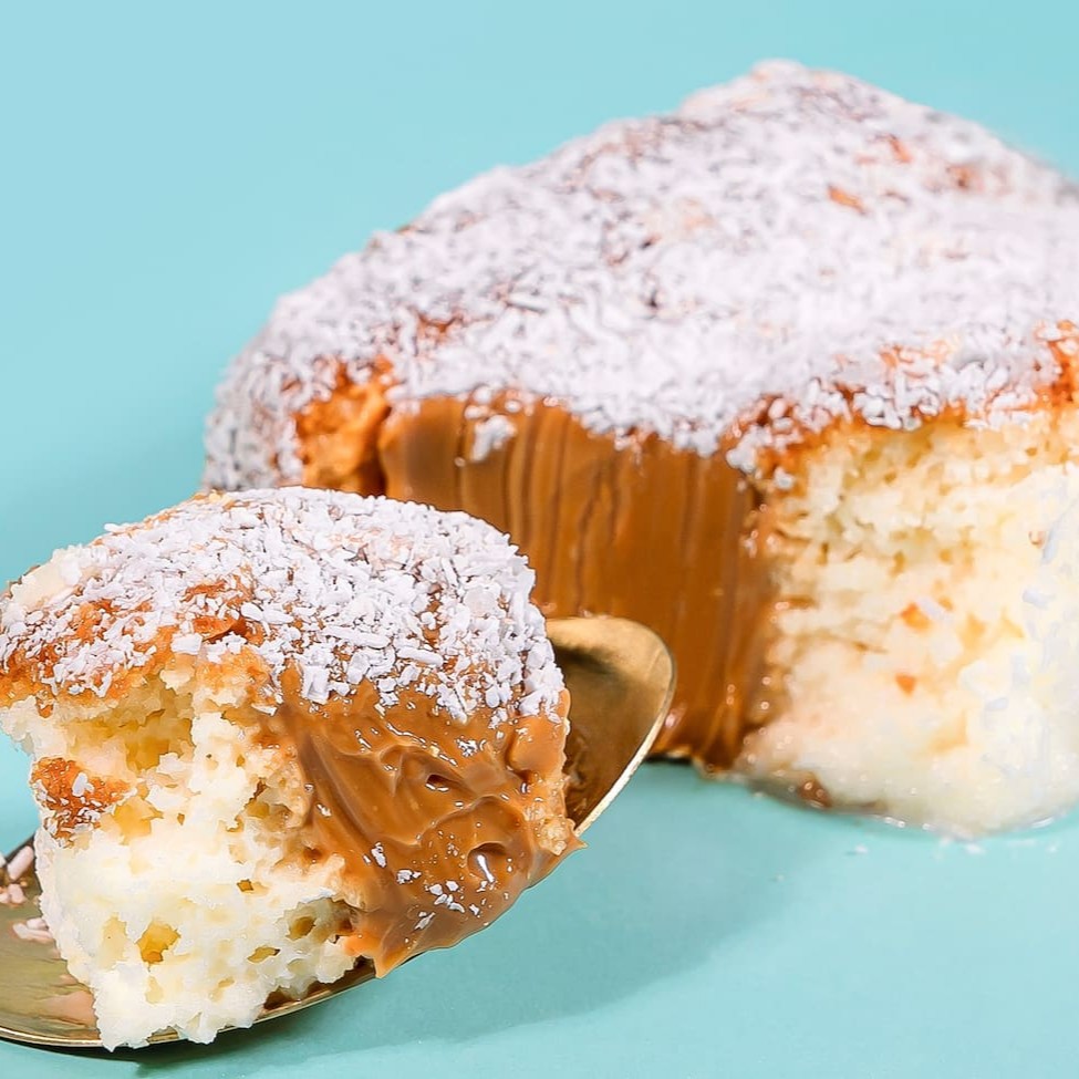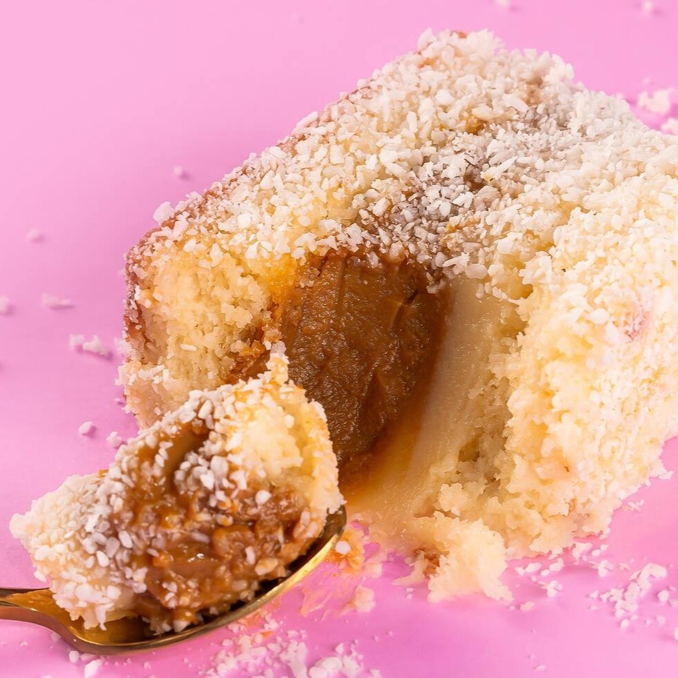 Pão de ló molhadinho, creme branco, doce de leite e coberto com coco.