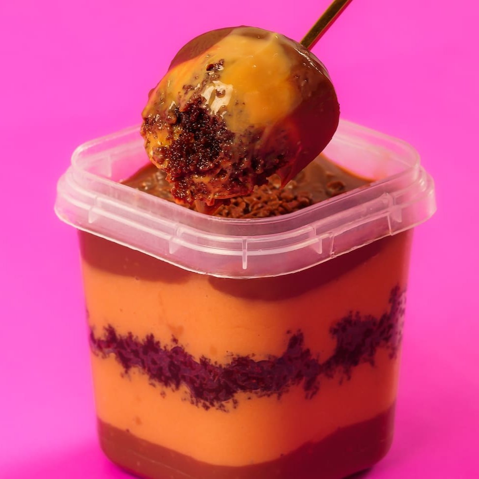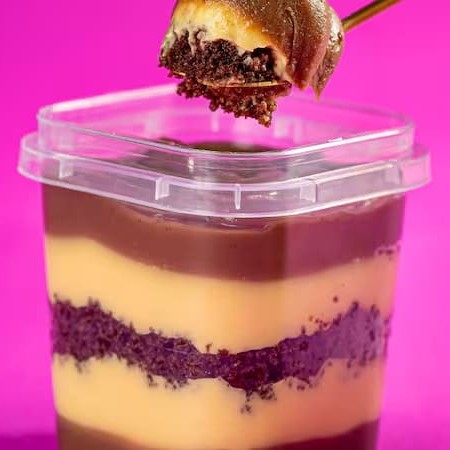 Brigadeiro cremoso, creme de doce de leite e massa de cacau. Peso médio 200g.