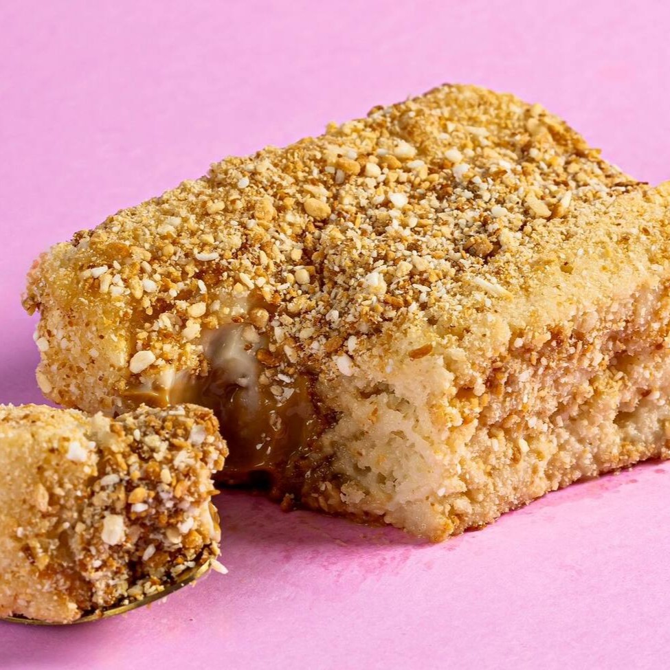 Pão de ló branco, doce de leite cozido, creme branco com abacaxi. Passado no coco queimado.