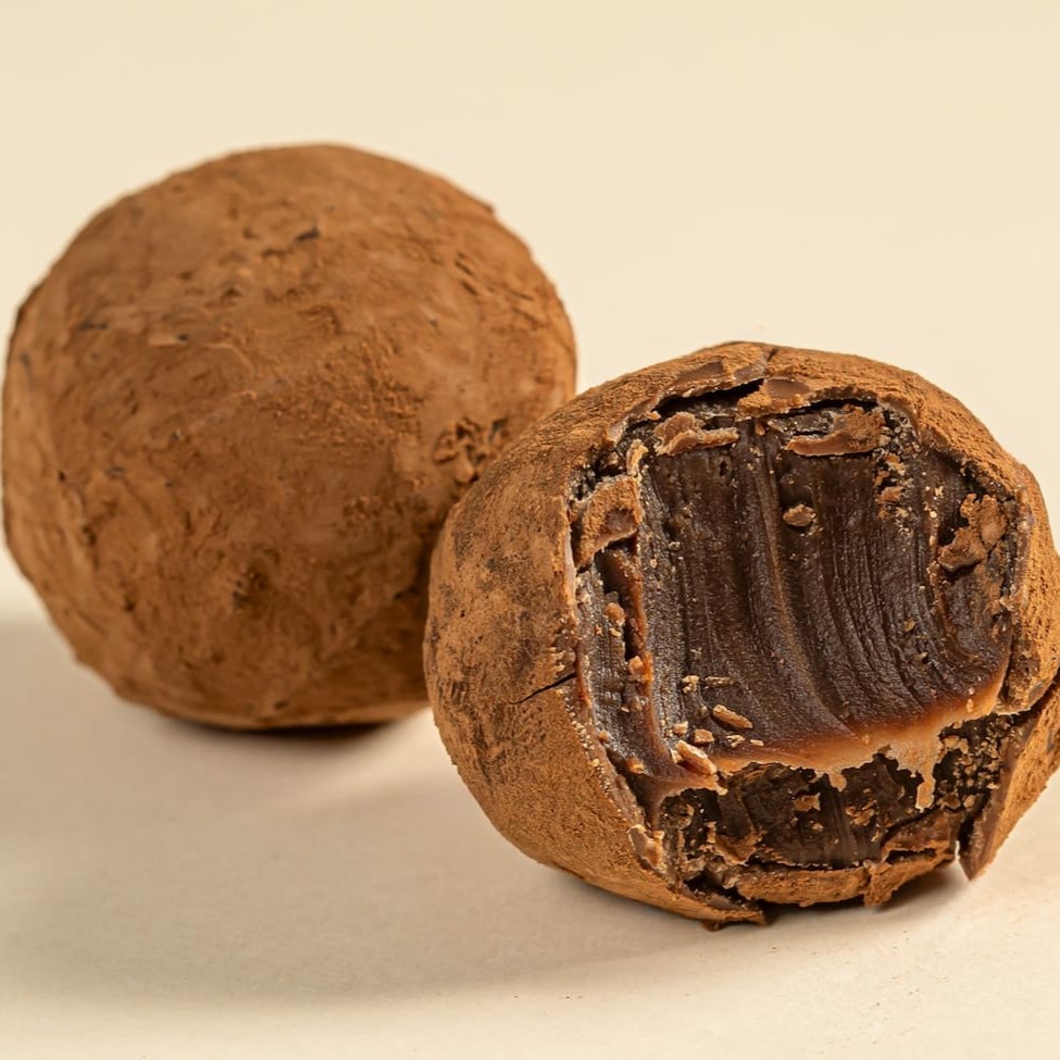 Brigadeiro 70% cacau, coberto com chocolate ao leite e cacau em pó.