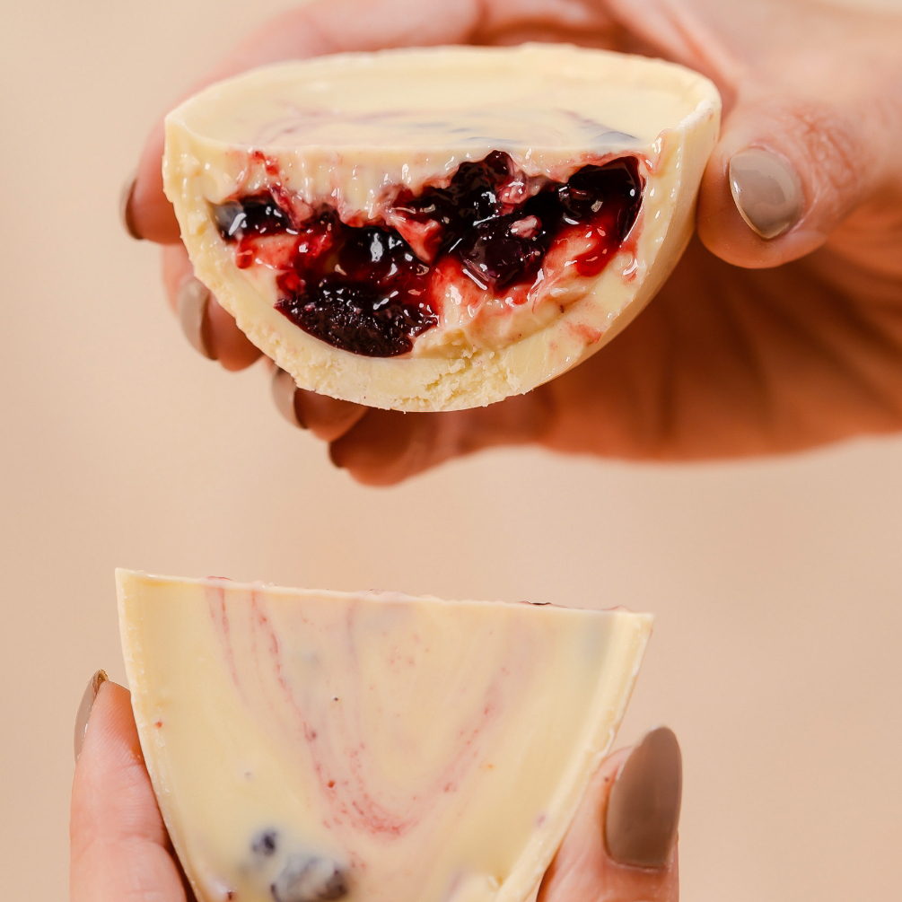 Mini ovo 110G de chocolate branco com creme de Amarenas (cereja italiana) e iogurte!