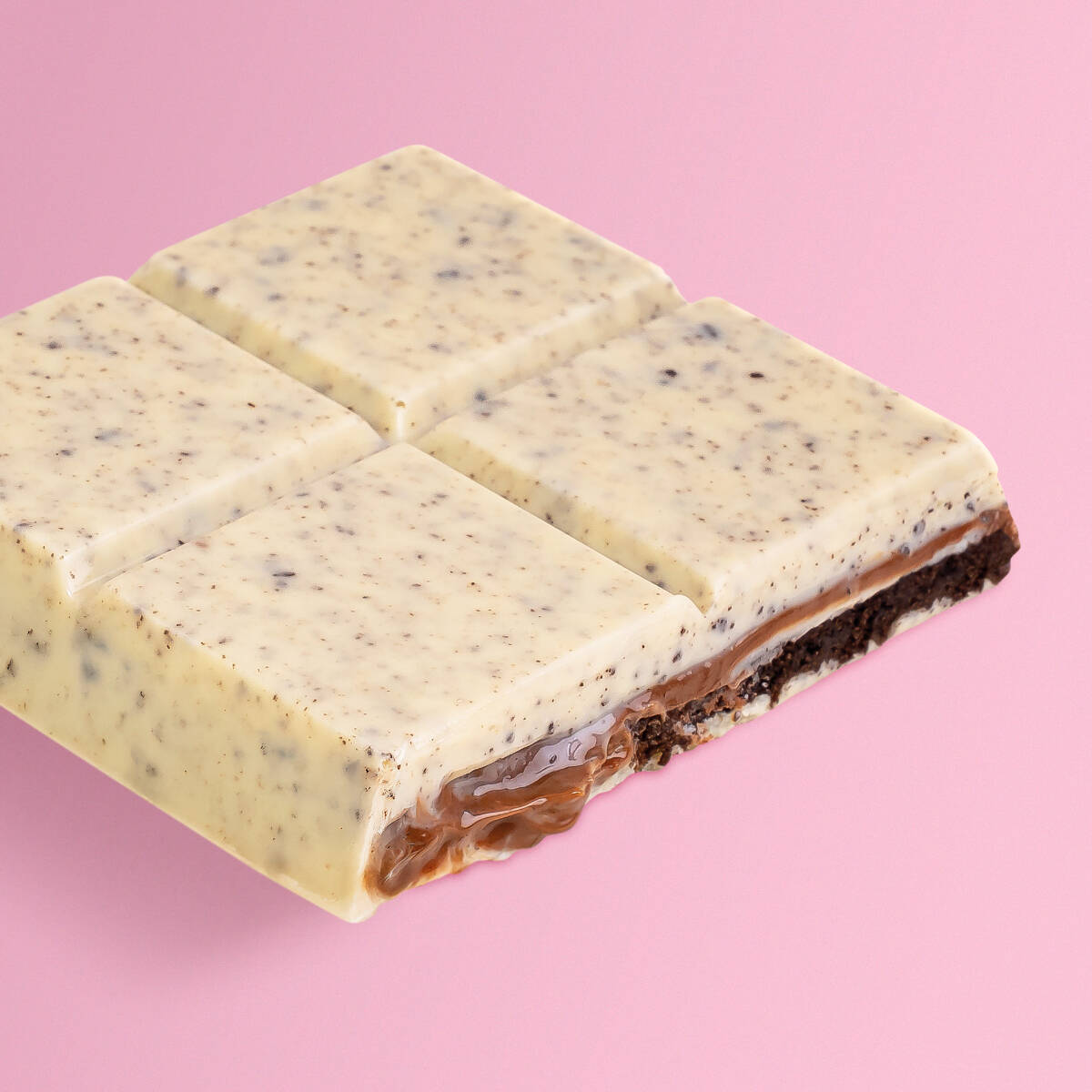 Massa de baunilha, pedaços de Oreo e recheio de Nutella branca.
