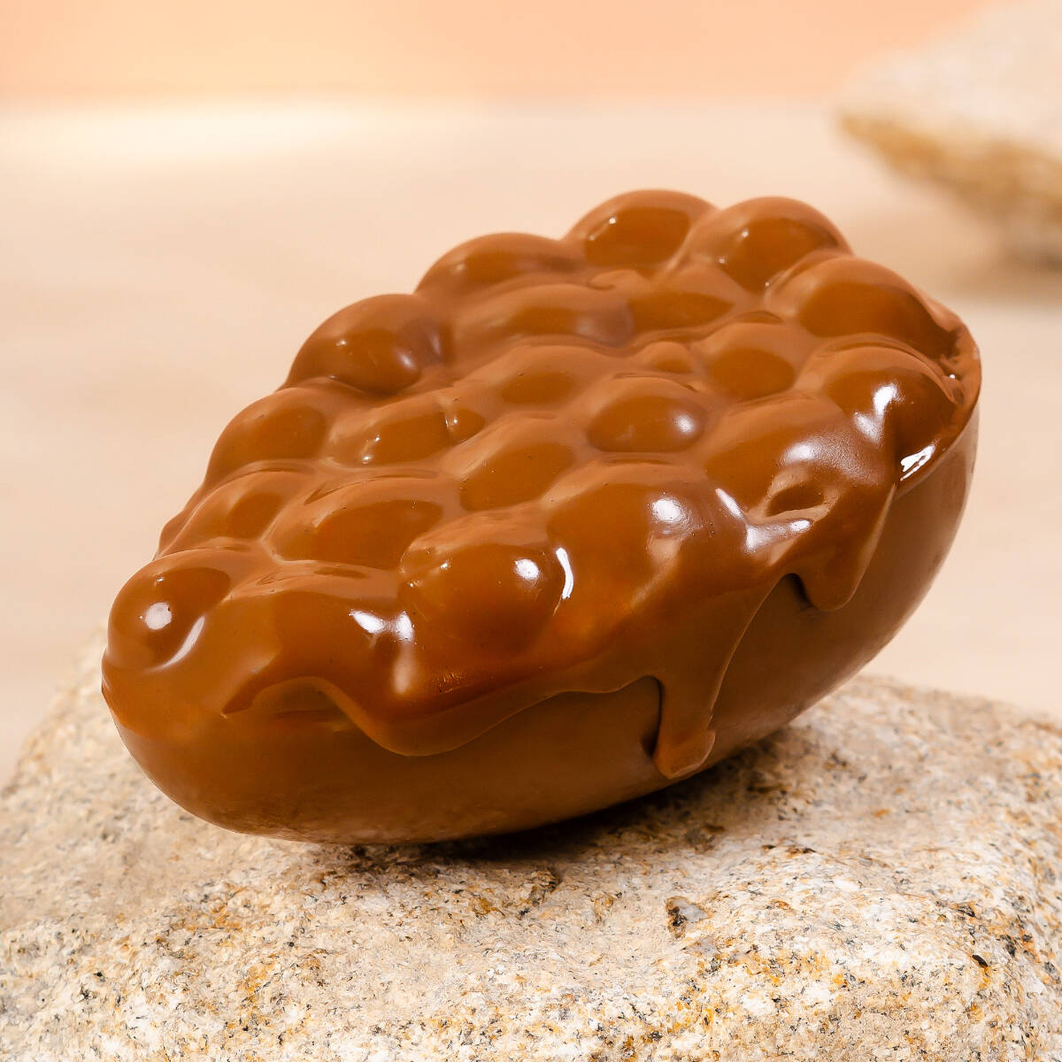 Massa de cascão de baunilha, recheado com gilato de caramelo com especiarias, caramelo salgado. Coberto com casquinha de chocolate e biscoito. Peso 120g