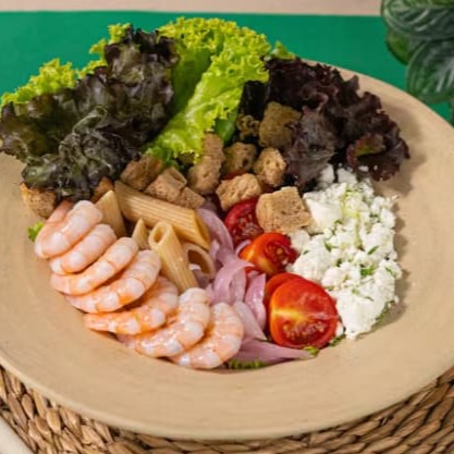 Camarão, acompanhado do nosso mix de folhas, tomate cereja, penne integral, cebola ao vinho, ricota com ervas e croutons. Acompanha molho de mostarda e mel.