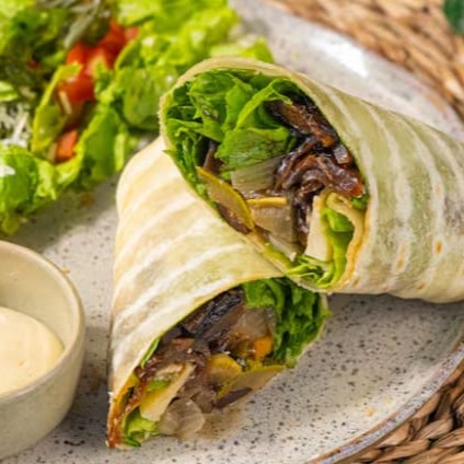 Wrap com Shimeji, alface americana, caponata, queijo parmesão e molho aioli Giro.