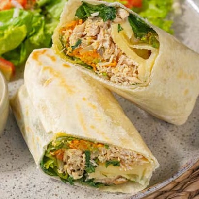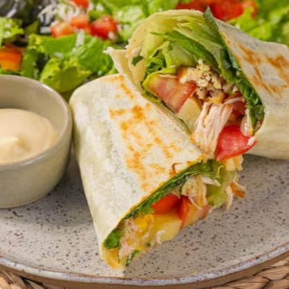 Wrap de frango desfiado, alface americana, espaguete de legumes refogado, queijo muçarela e molho Dijon Giro.