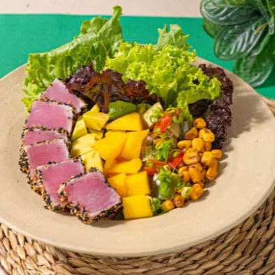 Atum na crosta de gergelim, acompanhado do nosso mix de folhas, caponata, abacate, manga, milho torrado, finalizado com mix de gergelim e cebolinho. Acompanha molho Teriyaki.