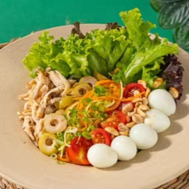 Frango desfiado, acompanhado do nosso mix de folhas, azeitonas verde, macarrão Bifum, espaguete de legumes refogado, tomate cereja, ovo de codorna, amendoim torrado, finalizado com cebolinho. Acompanha molho de mostarda e mel.