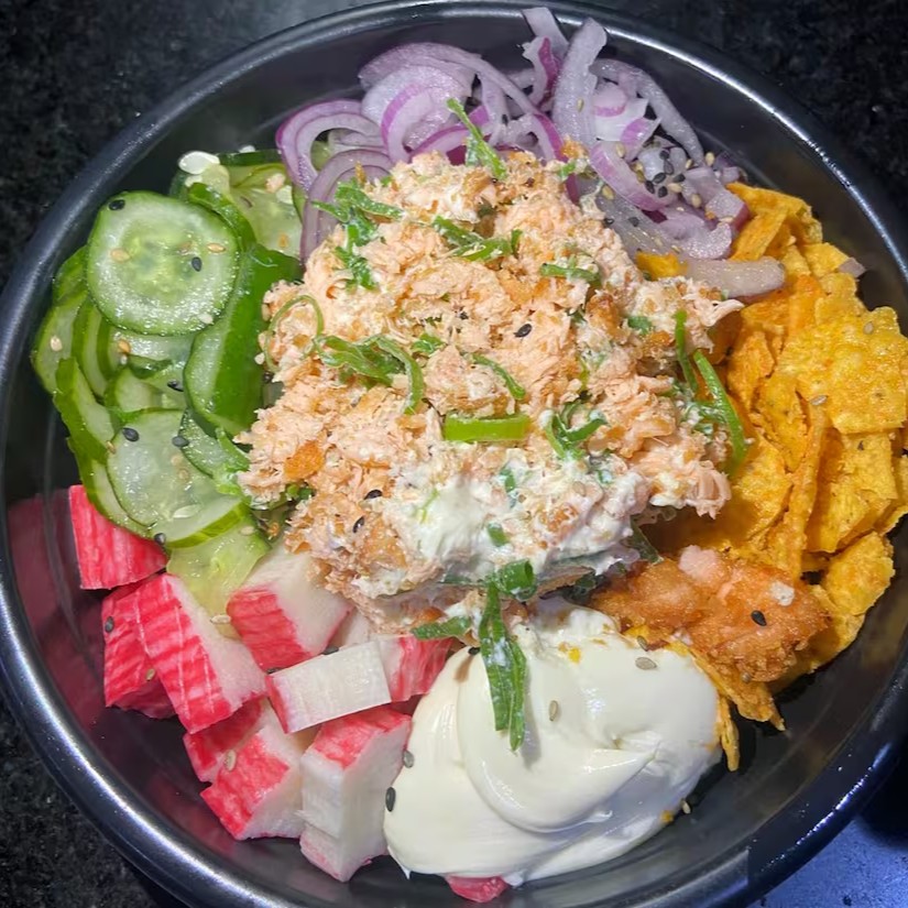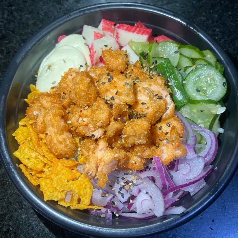 Arroz, salmão em cubos empanado, Kani, sonomono, cebola roxa, Doritos, cream cheease e cebolinha.