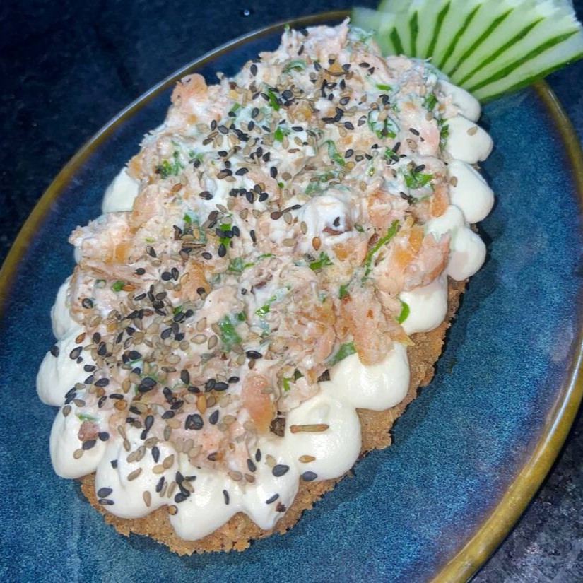 Arroz frito, cream cheease, salmão grelhado, cebolinha e gergelim.