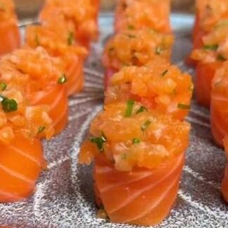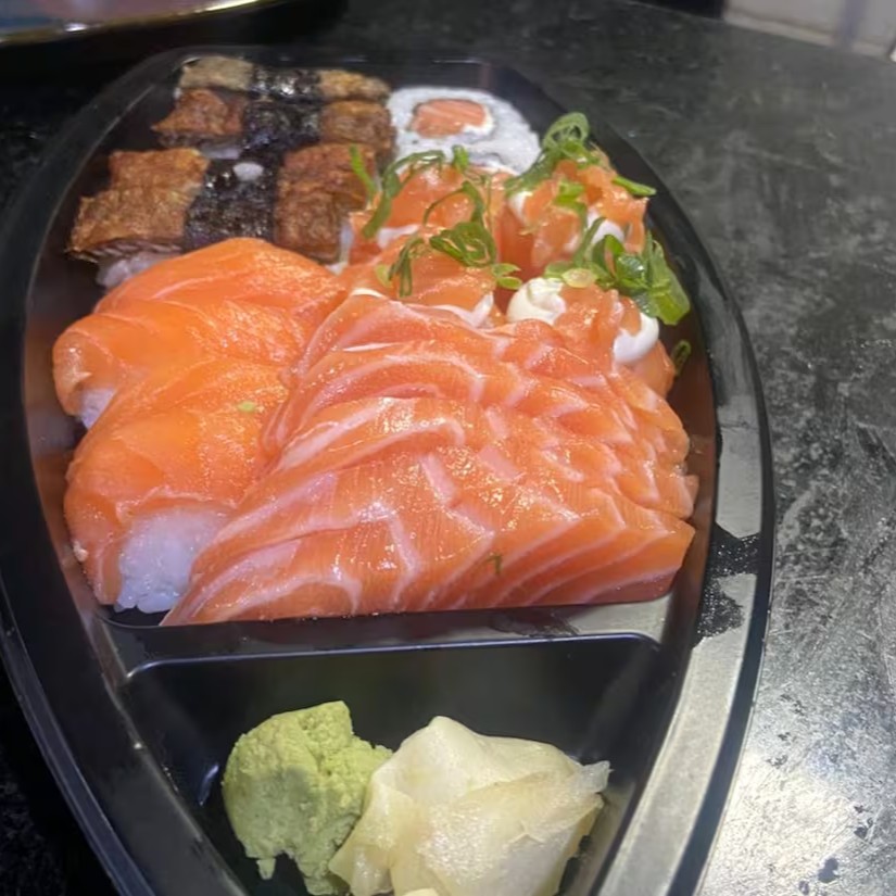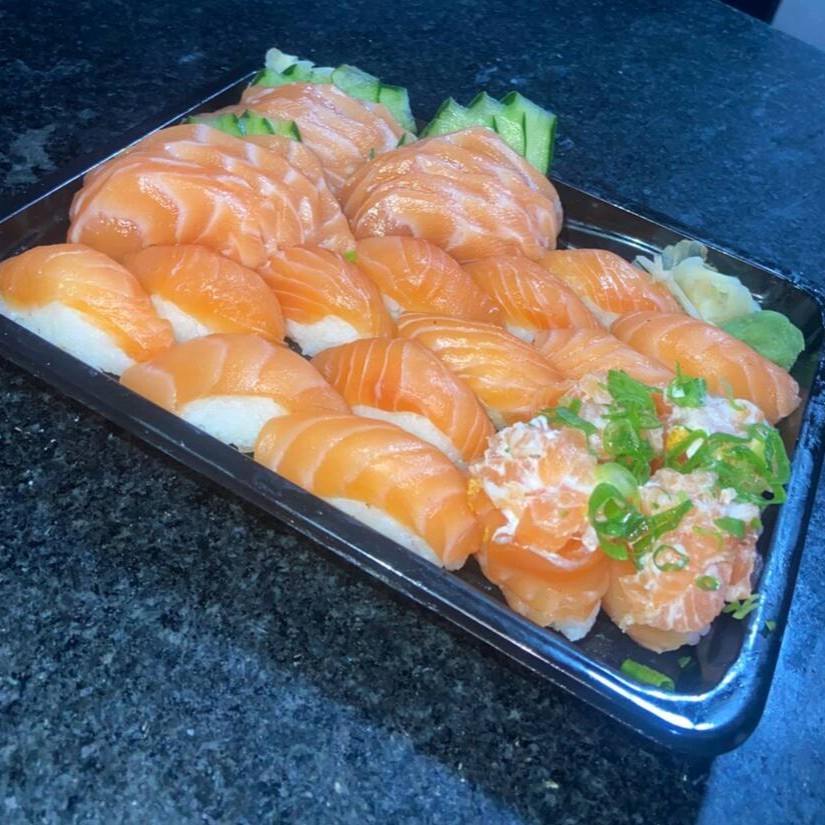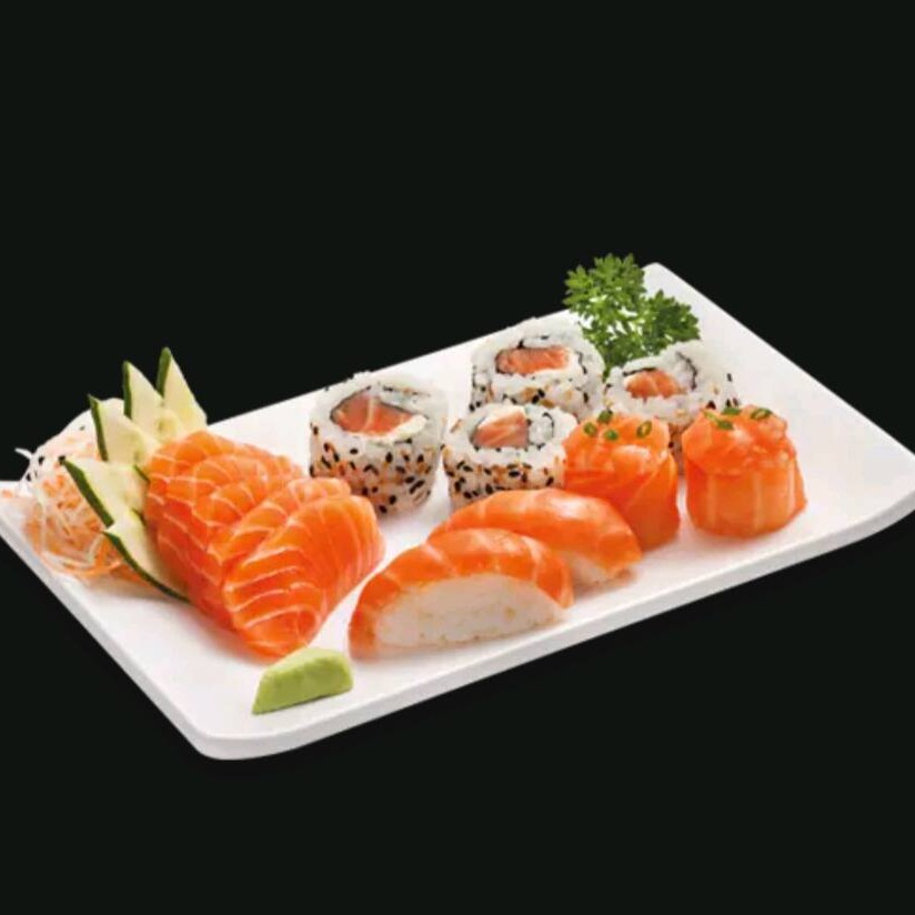 10 sashimis de salmão,8 hossomaki de salmão, 4 Uramaki de salmão,4 niguiri de salmão e 10 hot holls