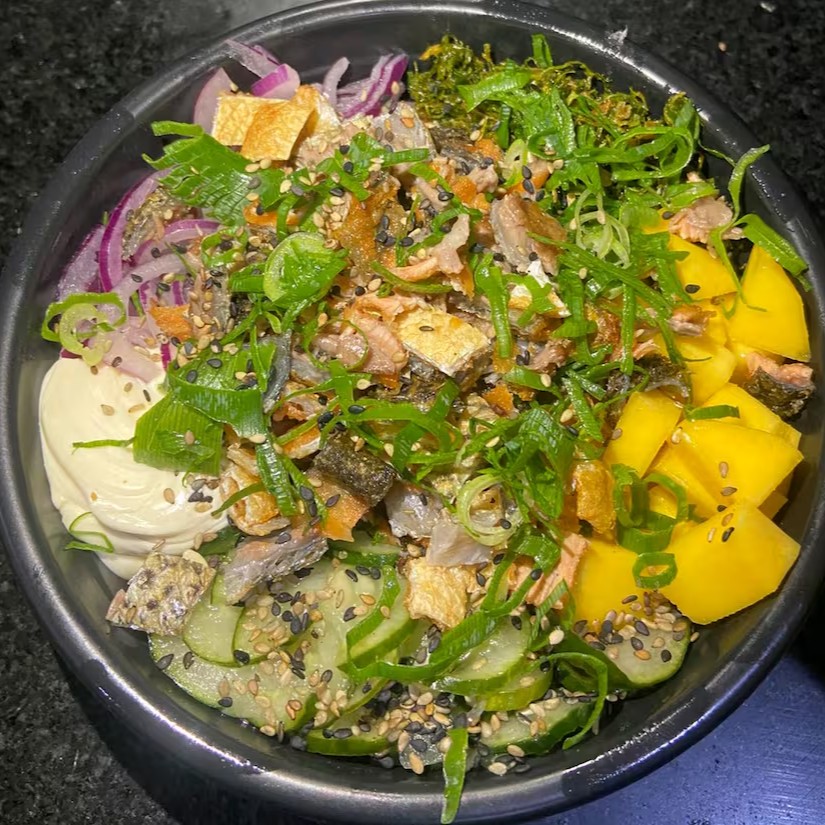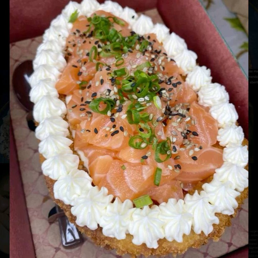 Arroz, salmão cru, manga, cebola roxa, sonomono, couve crispy, cream cheease e cebolinha.
