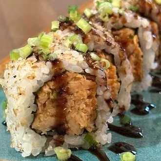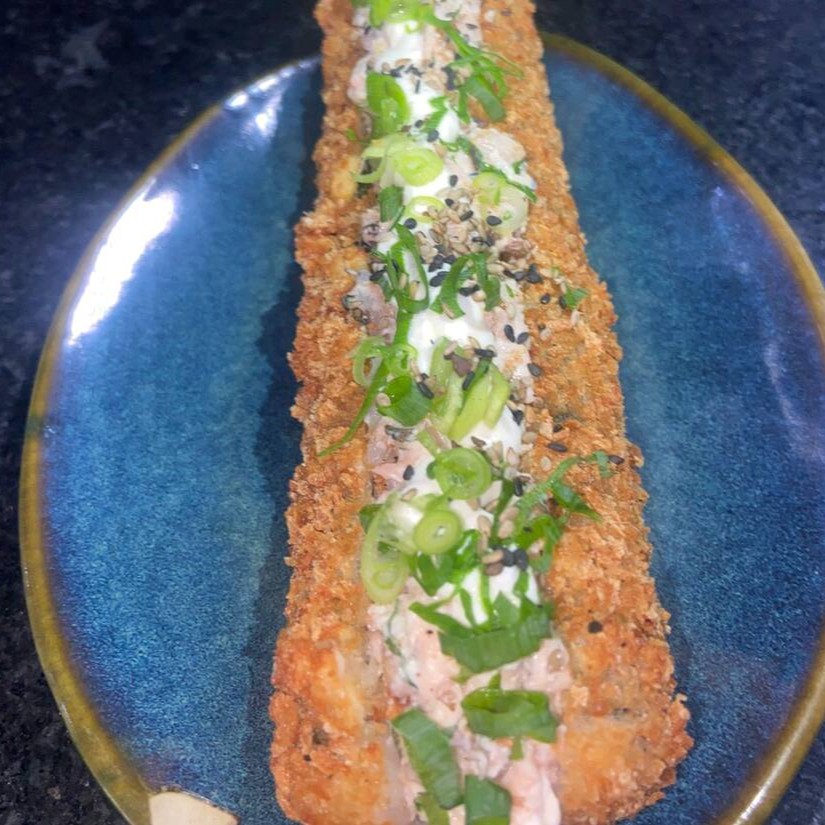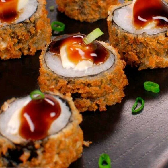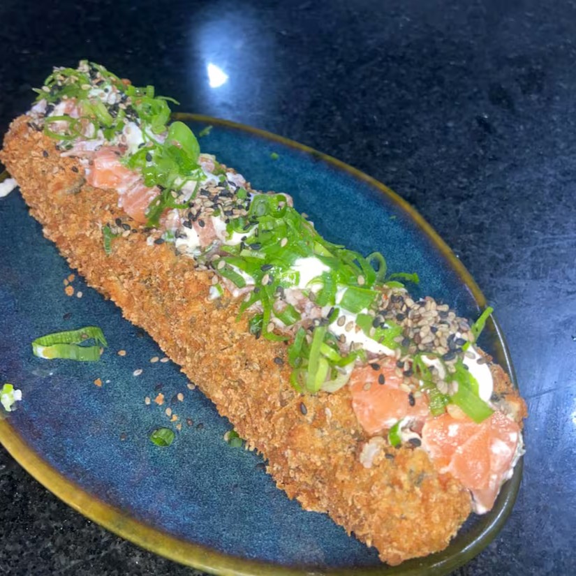 Arroz empanado, salmão cru, cream cheease e cebolinha ( imagem ilustrativa)