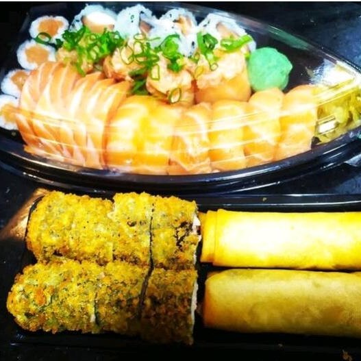 4 hossomaki de salmão,4 Uramaki de salmão,4 Joy de Salmão,6 niguiri de Salmão,5 sashimis de Salmão,8 hot holls e 2 harumaki de queijo