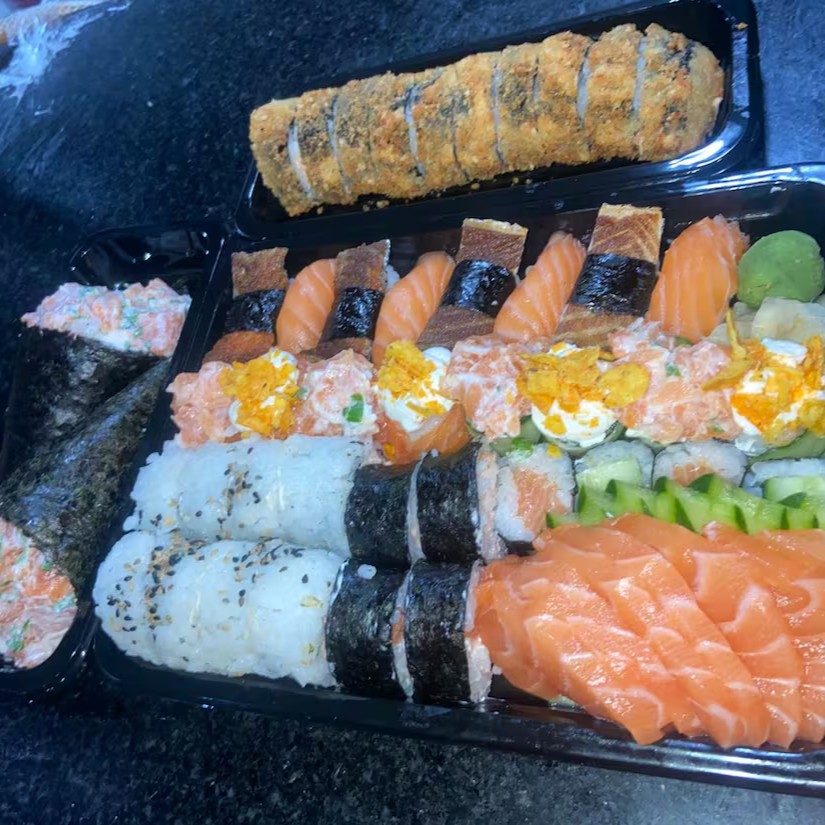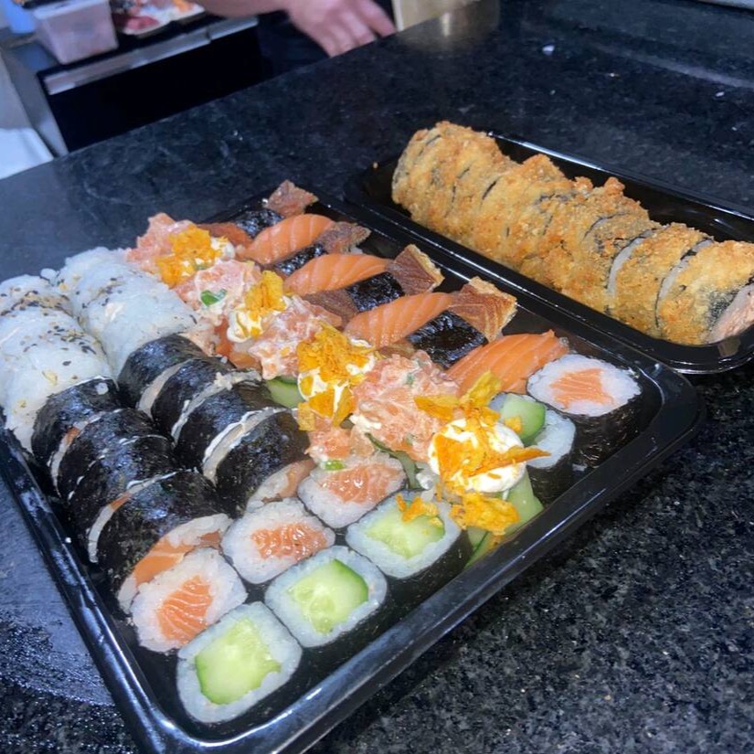 8 uramaki variado, 4 futomaki variado, 8 Joy variado, 4 niguiri skin, 4 niguiri salmão, 8 hot holl, 4 Hossomaki, 8 sashimi de salmão e dois temakis filadélfia