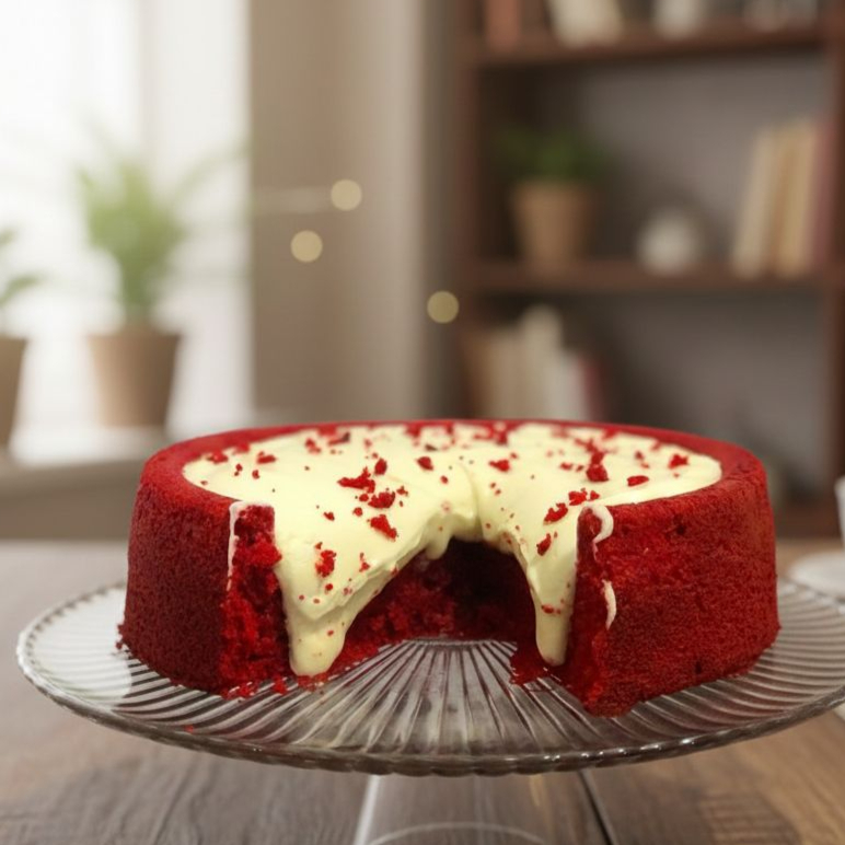 Um delicioso bolo piscina red velvet, com brigadeiro de ninho e cream chesse. Rendimento até 6 fatias.