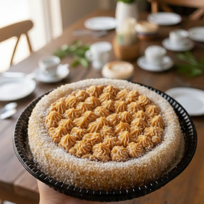 Um delicioso bolo de churros com cobertura de doce de leite. Rendimento 6 fatias.