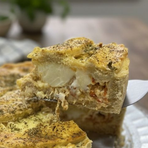 Uma deliciosa fatia de torta de frango desfiado e requeijão.