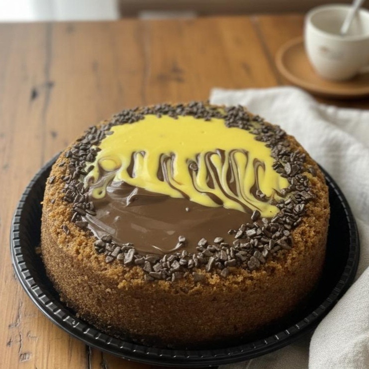 Um delicioso bolo de chocolate com cobertura de mousse de maracujá e chocolate. Rendimento 6 fatias.