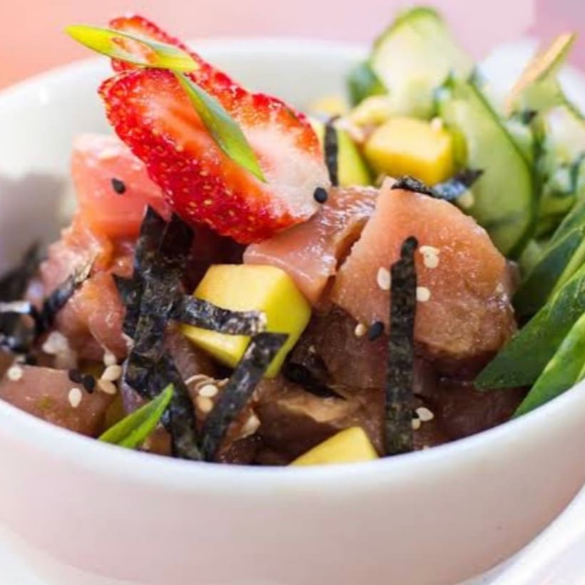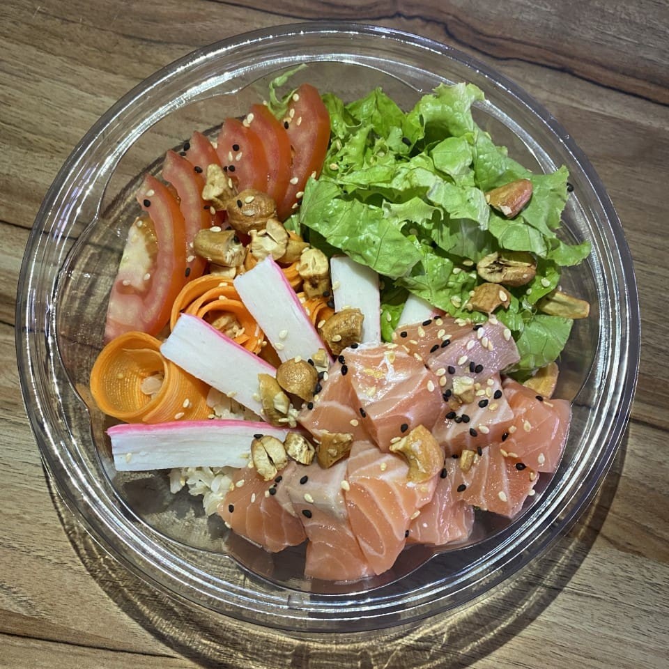 Arroz japonês, salmão fresco com bem pouco cream cheese, abacate, pepino japones, cebola crispy, couve crispy, amendoa laminada, gergelim, cebolinha, shoyo light, morango. 750 ml de pura gostosura.