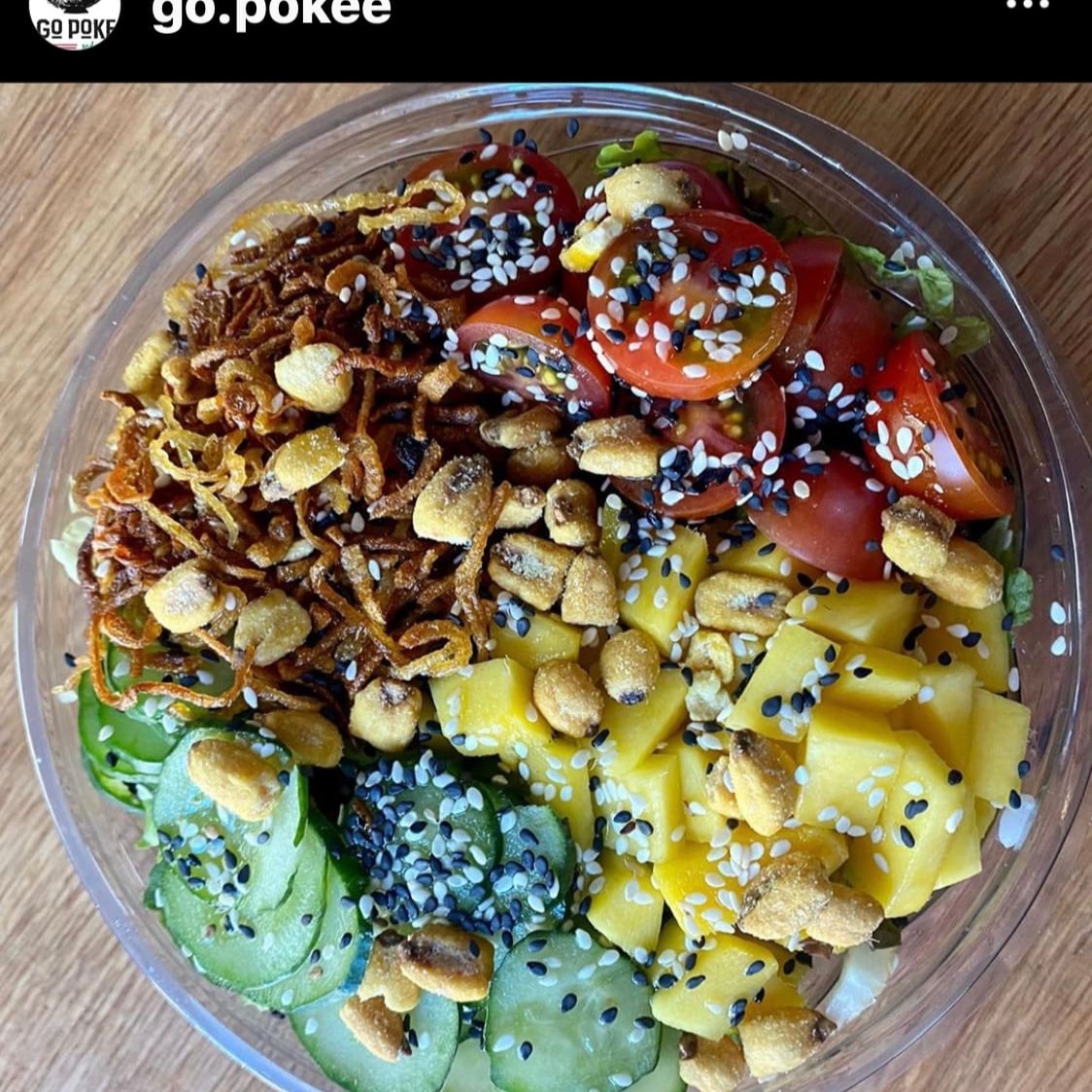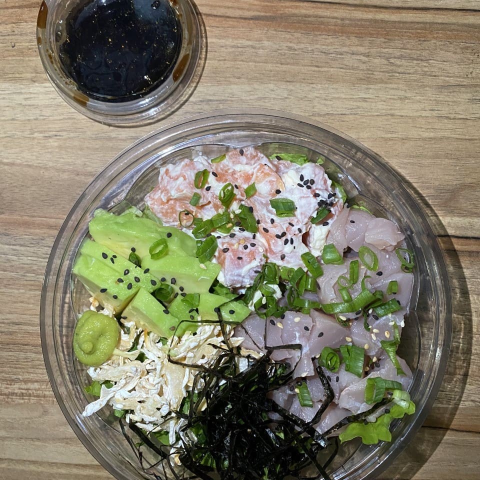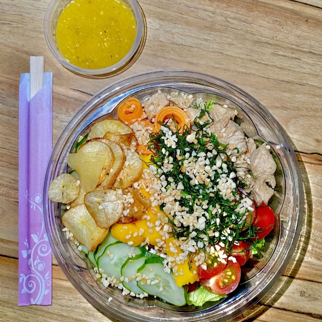 Arroz gohan, mix de folhas, frango 100gr, molho hawaian, tomate cereja,cenoura, pepino japones,manga, abacate,chips de mandioca, couve crispy e amendoim . 750ml