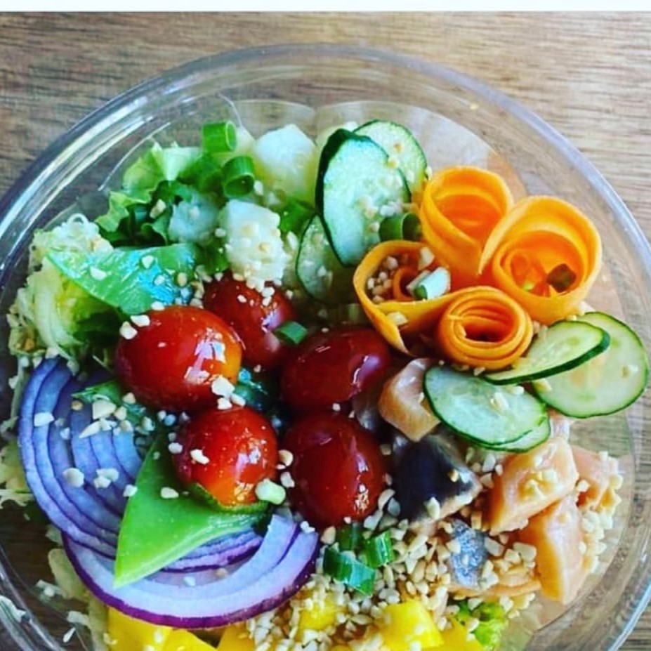 Salad poke especial Base: espaguete de abobrinha, mix de folhas Topping: cenoura, pepino japonês, rabanete Crunches: palha de nori, cebola crispy Finalizações: gergelim, cebolinha, cebola roxa Nut: chips de coco
